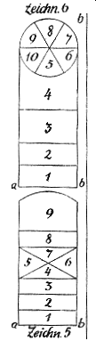 Der Stein muß platt, nur etwa einen kleinen Finger dick sein. Man nimmt dazu gern ein Stück Dachziegel, das man ganz rund oder länglich rund abklopft. Er ist fast so groß als die Mündung eines Trinkglases. Spieler können zwei, drei und mehr sein. Auf einem großen Saal zeichnet man die Figur mit Kreide, im Freien muß man einen ebenen, etwas sandigen, oder überhaupt einen weichen Boden haben, damit man sie mit einem Stabe hineinreißen kann. Sie ist etwa zwölf bis vierzehn Schritte lang. Im Grunde ist eine solche Figur sehr willkürlich, um sich aber eine Vorstellung davon zu machen, muß ich schon ein paar als Muster aufstellen. Siehe Zeichnung 5 und 6. Jene ist aus England entlehnt.
