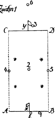 Man bezeichne auf ebenem Rasen den Anfangs- und Endpunkt X und Y der Spielbahn, etwa 30 bis 40 Schritte voneinander, so ist die Vorbereitung fertig; will man aber genauer sein, so werden die beiden Linien A-B und C-D etwa 30 Schritt lang mit einem Stabe in den Boden gerissen und ihre Enden sowie auch die Stellen 4 und 5 mit Stäben bezeichnet.Hierdurch wird auch zugleich die Breite der Spielbahn bestimmt.