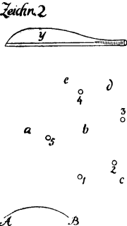 2Eine Bogenlinie A—B, Zeichnung 2, macht das Schlagmal, von hier aus wird der Ball wie beim deutschen Ballspiel geschlagen. Statt des Fangmals sind seitwärts so viele Freiplätze mit Stäben aufgesteckt und mit Taschentüchern bezeichnet, als eine Partei Personen hat, doch wird hierbei das Schlagmal als ein Freiplatz mitgezählt. Sie sind mit 1, 2,3, 4, 5 bemerkt und werden zehn bis fünfzehn Schritt voneinander ganz nach willkürlicher Richtung abgesteckt. Der Schläger hat im Mal drei Schläge. Hat einer davon den Ball nur so viel berührt, daß man es zischen hört, oder will man weniger streng sein, daß der Ball dadurch aus dem Mal herausgestoßen wird, oder hat er dreimal durchgeschlagen, so muß er von A-B ab durch alle jene Plätze nach und nach fortlaufen, bis er wieder ins Mal kommt. Sind viel Personen auf einer Partei, so sind der Freiplätze mehr, mithin wird die Laufbahn dadurch auch länger. - Die Dienenden stehen willkürlich hinter, neben und zwischen diesen Freiplätzen, z. B. in a, b, c, d, e, weil der Ball dorthin geschlagen wird