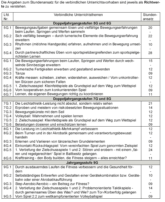 Verbindliche Themen - Klasse 5-9 ( Gymnasium - G 8 ) zurück Start | Lehrplan - was ist neu ? | Pädagogische Perspektiven | Bewegungsfelder | Methoden | verb. Themen | verb. Wahlthemen | Wahlthemen | Links