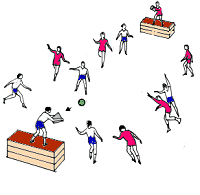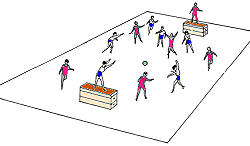 Ball zum Kasten (Turmball) Ein Spieler jeder Mannschaft kniet oder steht auf einem Kasten.