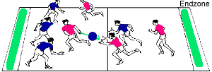 Damit sind die Hauptregeln gegeben. Es zeigt sich, dass der Ballträger die Schlüsselfigur des Spielablaufs ist. Nach dem Ballempfang hat er ohne Zögern nach vorn wegzusprinten. Ein Abgabespiel innerhalb der eigenen Mannschaft rückwärts ist sinnlos, weil dadurch das Spiel immer mehr in die gefährliche Nähe der eigenen Grundlinie gezogen wird. Der Ballträger muss also versuchen, den Gegner mit vollem Tempo zu überlaufen oder ihn mit geschickter Körperbewegung zu umgehen.Die Taktik