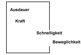 Kraft Fähigkeit, einem äußeren Widerstand zu überwinden oder ihm entgegenzuwirken Schnelligkeit Fähigkeit, motorische Aktionen möglichst schnell durchzuführen Ausdauer Widerstandsfähigkeit des Organismus gegen Ermüdung bei langandauernden Belastungen Beweglichkeit Aktionsradius der Gelenke und die Dehnfähigkeit der Muskulatur