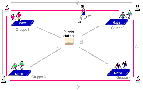 Laufstrecken Die Laufstrecken können variabel gestaltet werden. In kleinen Hallen oder auf kleinen Sportplätzen kann zunächst eine Runde (A) gelaufen werden. Dann wird ein Puzzleteil für die Gruppe geholt. Bei größeren Spielfeldern wird direkt zur Puzzlestation (B) gelaufen. Steht ausdauerndes Laufen im Mittelpunkt, können die Laufstrecken beliebig verlängert werden (z. B. mehrere Runden, 2 Schüler holen jeweils ein Teil etc.).