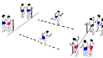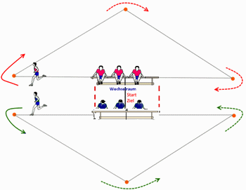 Jede(r) Schüler/in legt nur eine kurze Teilstrecke zurück bis zum gegenüberliegenden Wechselmal.Die Staffel ist durchlaufen, wenn nach Vereinbarung entweder jede Gruppe ihren alten Platz erreicht hat (2 Laufstrecken) oder wenn jede auf dem Platz der gegenüberstehenden sich befindet (1 Laufstrecke).